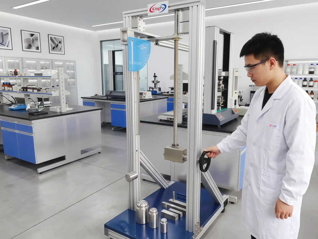 I set up the KINGPO IK01‑06 spring impact hammer according to the testing process requirements. I select the appropriate hammer head for the desired impact energy level. I calibrate the hammer using the included calibrator. I adjust the spring mechanism to match the IK rating needed for the testing process. I position the hammer perpendicular to the surface of the sample. I make sure the hammer is stable and ready for repeated impacts. I review the settings and confirm that the hammer aligns with IEC 62262 and IEC 60068-2-75 standards.