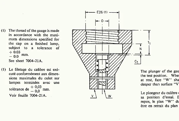 - When the unmounted E26d cap is pushed into the gauge as far as it will go, surface W of the plunger shall not project beyond surface X. For caps on finished lamps, surface W shall not project beyond surface V, with the cap positioned so that the solder on the intermediate contact is located in the recess provided in the gauge. This verifies that the screw thread dimensions meet the exact IEC 60061-3 requirements.