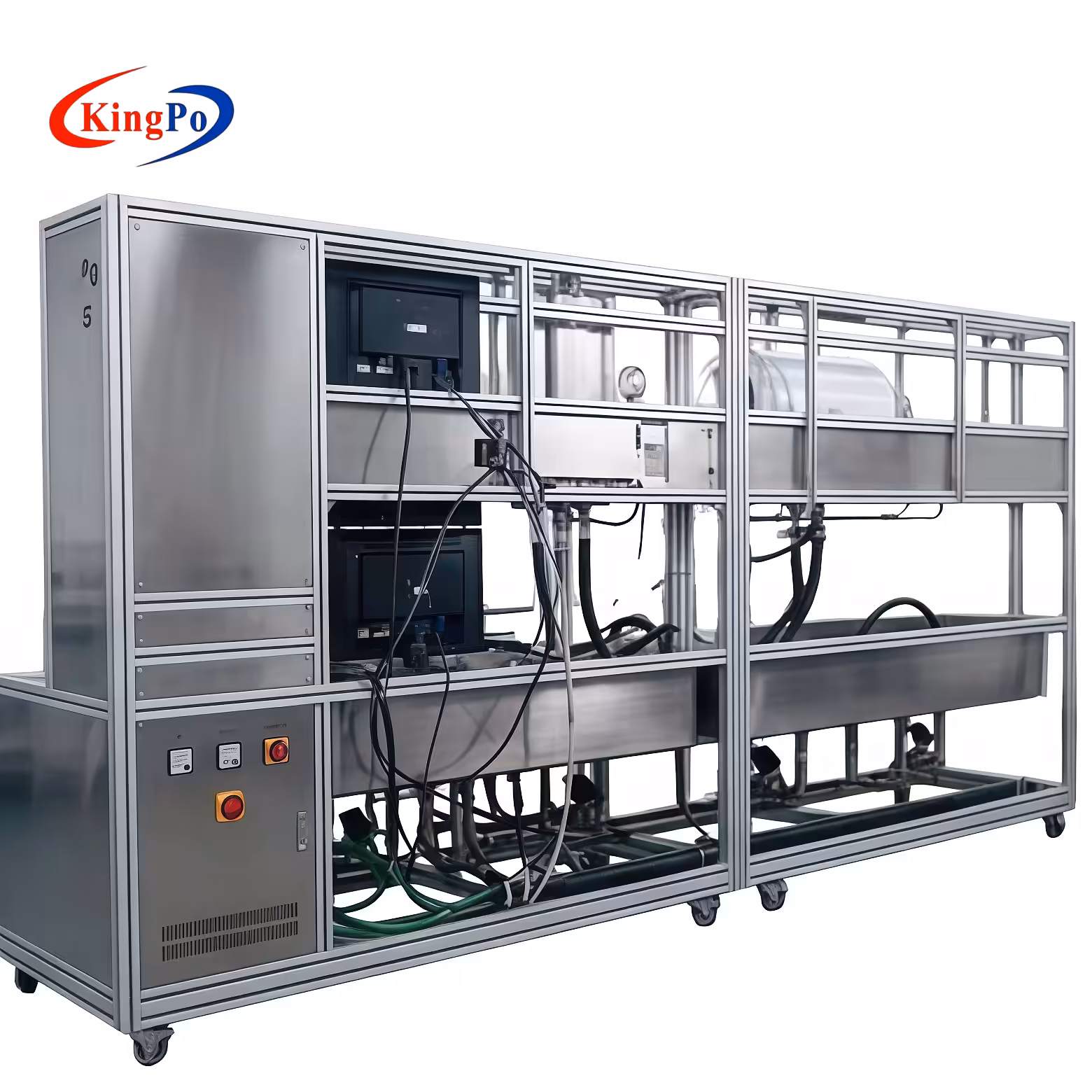 The Water Heater Performance Tester is a dual-station test platform engineered by KingPo to evaluate the heating performance, sealing, temperature distribution, and electrical safety of horizontal and vertical storage-type electric water heaters in strict accordance with IEC 60335-2-21:2012 (Clauses 22.102, 24.102.1, 24.102.2). It simulates real operating conditions with controlled water and electricity supply, measuring outlet water temperature, case temperature, average temperature, and five critical safety parameters: withstand voltage, leakage current, insulation resistance, grounding resistance, and power.