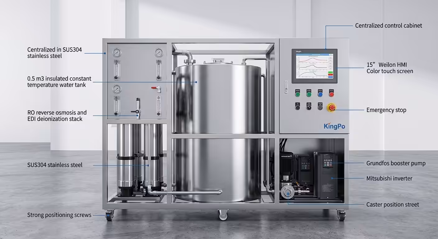 Advanced Water Purification Architecture โ Combines a 0.5 m3/h pure water machine with high-efficiency RO reverse osmosis and EDI modules to ensure a consistent baseline before precise hardness dosing.