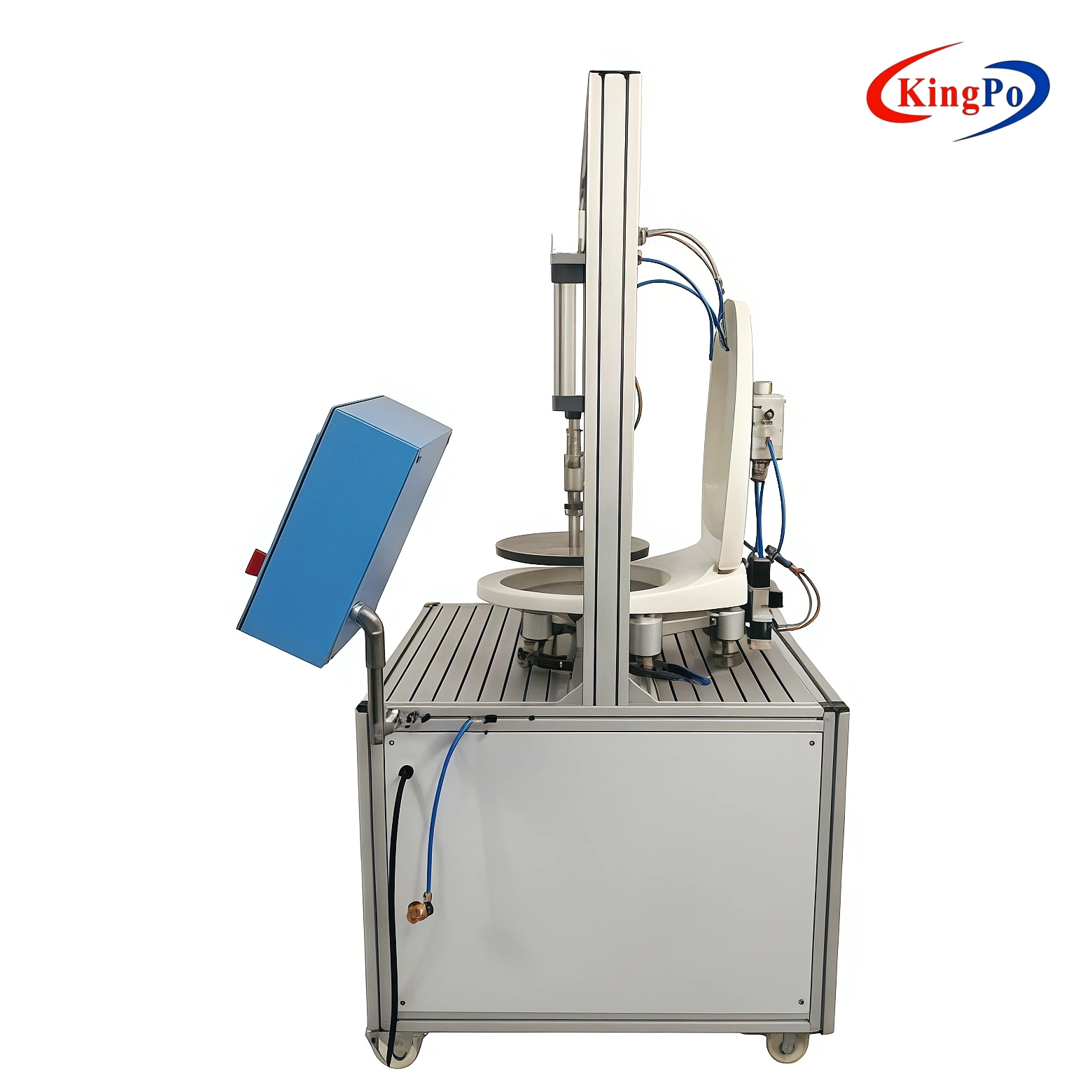 The Toilet Seat Endurance Test Apparatus is a professional, high-precision testing system manufactured by KingPo. It is specifically designed to perform the rigorous endurance test specified in IEC 60335-2-84 Clause 21.103.1 for toilet seats and similar household appliances. The system applies an evenly distributed force of 1250 N perpendicularly to the seat for 4 seconds using a calibrated rubber disc (ร300 mm, thickness 10 mm, Shore A 70ยฐ) combined with a steel disc (ร300 mm, thickness 5 mm), repeating the cycle 20,000 times to verify long-term mechanical durability and safety performance under repeated loading conditions.